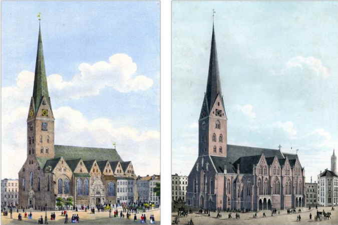 St. Petri in Hamburg ist die älteste Pfarrkirche in der Stadt. 2 alte Stiche.